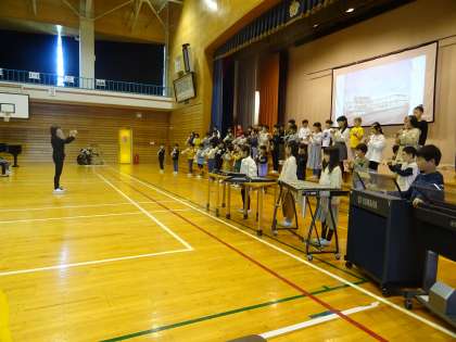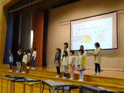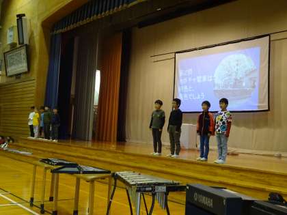総合的な学習の時間に見付けた「大庄のすてき」をスライドにまとめ、発表しました。器楽合奏「カントリーロード」も披露しました。