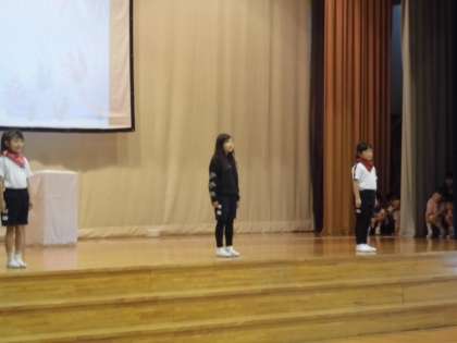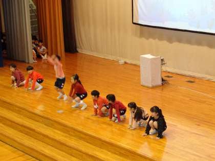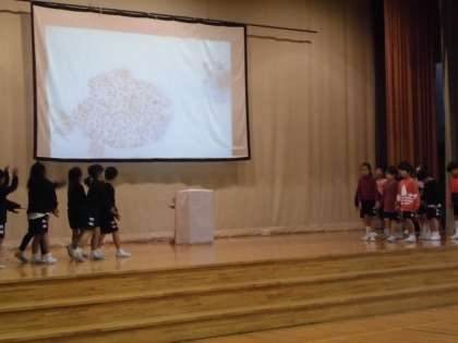 学習発表会では、国語科で学習した「スイミー」を体をつかって表現しました。はじめの言葉の人たちは、堂々と話すことができました。赤い魚たちは、海でみんなで楽しく暮らしている様子を表現し、マグロは体を大きく動かしたり足音を大きくしたりして工夫をしていました。