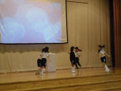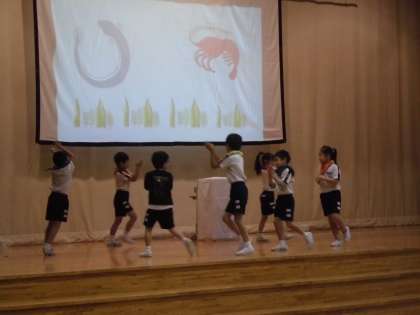 学習発表会では、ひとりぼっちになってしまったスイミーをくらげやこんぶ、わかめ、いせえび、うなぎたちが元気づける場面がありました。みんな体全体を大きく動かしたり、ステージを移動したりして生き物になりきって表現することができました。