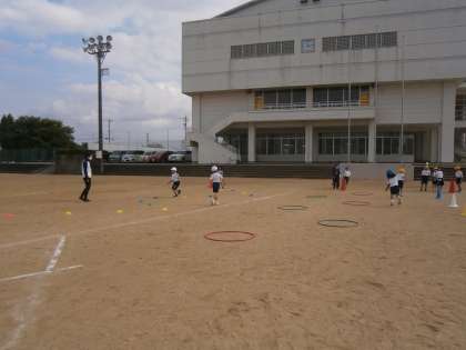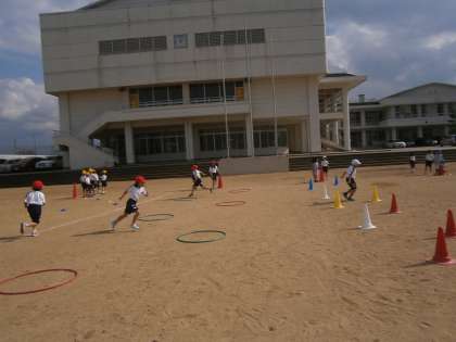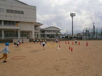 体育の時間はかけっこをしました。いつものようにまっすぐ走るのではなく、コーンやフープをおいて、回り込みながらくねくねと走ります。何度か練習を重ねると上手に走れるようになりました。