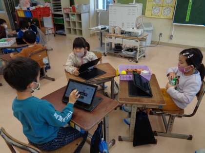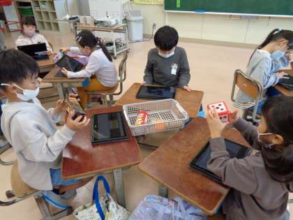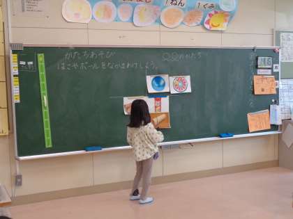 今日の算数では、箱の形に着目していくつかのグループに分けました。真四角と長四角があることや、丸いところとそうでないところにあることに気付いていました。「ボールの形」「筒の形」「サイコロの形」「長四角の形」に分けることができました。