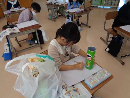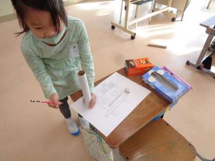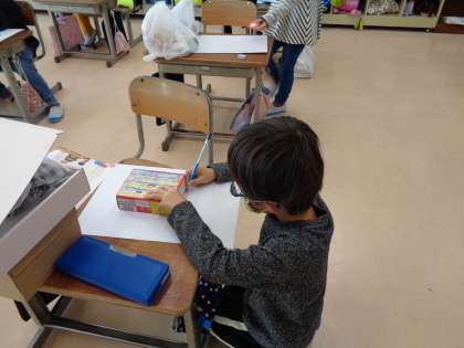 今日の算数では、箱のかたちを紙に写して絵を描きました。電車のタイヤは筒の形、窓は四角の形などといろいろ考えながら描いていました。