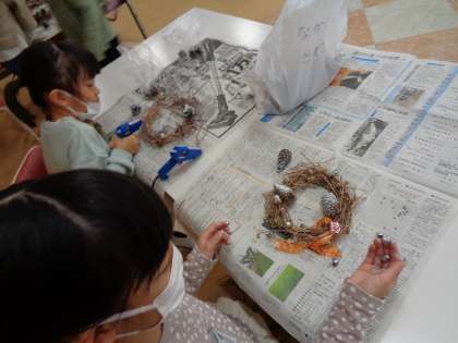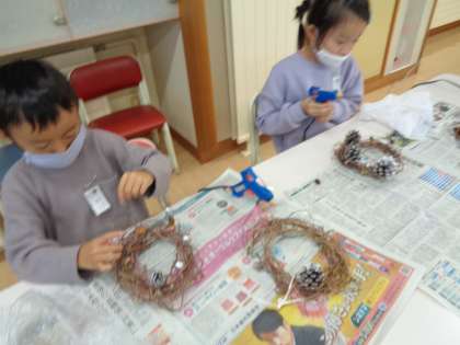 自分たちが育てたあさがおのつるをリースにして、飾りをつけました。自分たちで拾ってきたどんぐりやまつぼっくりに銀の色をつけて、グルーガンでくっつけました。どれも初めての体験でしたが上手に完成しました。素敵なクリスマスの飾りになるといいですね。