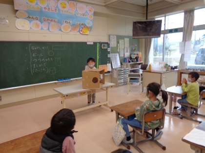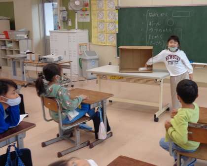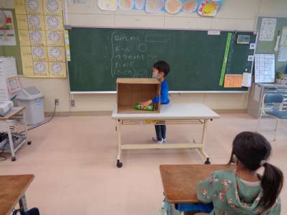 算数では、形当てゲームを行いました。箱をよく触りながら一生懸命考えていました。