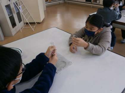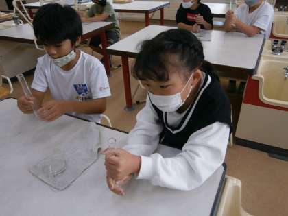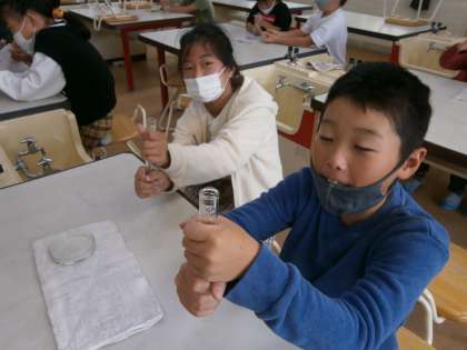 「あっ、ふくらんできた!」「試験管を横にしてもふくらんでくるよ!」