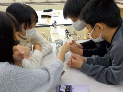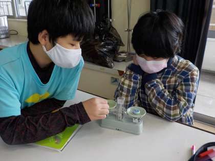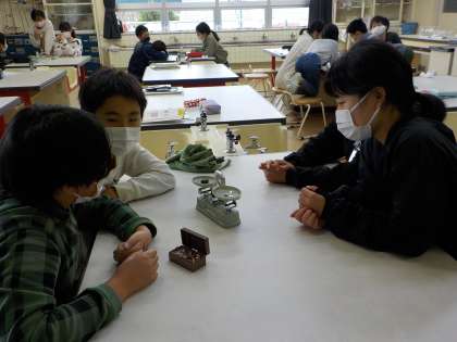 上皿てんびんの使い方を学習しています。分銅の持ち方や分銅を乗せる順番などを正しく学んでいました。