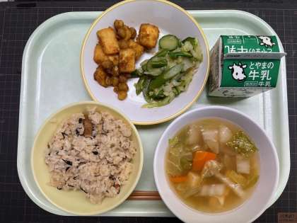 【献立】 ひじきごはん、牛乳 いかと豆のカレー揚げ グリーンサラダ 豆腐スープ