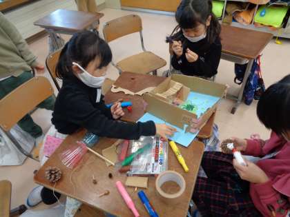生活では、あきのおもちゃを完成させました。もし、誰かがこのおもちゃで遊ぶとしたら、といろいろな工夫が見られました。