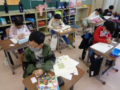 前回、国語の授業で調べたことわざの意味をもとに、今回はことわざかるたを作りました。ことわざ・絵・意味の3枚セットで作っていきましたが、それぞれ意味を表す絵が違っていたりと、個性豊かな絵がたくさんありました。