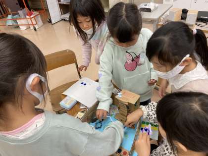 生活の時間に、友達の秋のおもちゃで遊びました。店番役とお客役に分かれ、遊び方を教えてもらいながら夢中に遊んでいました。手作りのおもちゃは、一味違いますね。