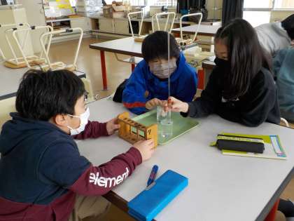 水を温めたり、冷やしたりしたときの体積の変化について、実験しました。わずかな変化に目をこらしながら見ていました。