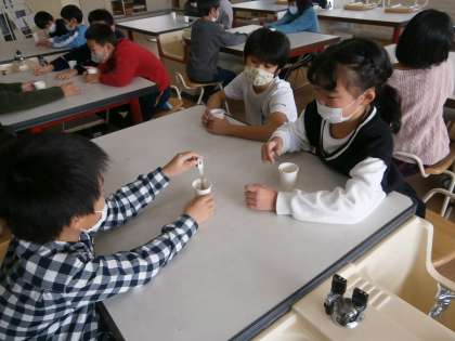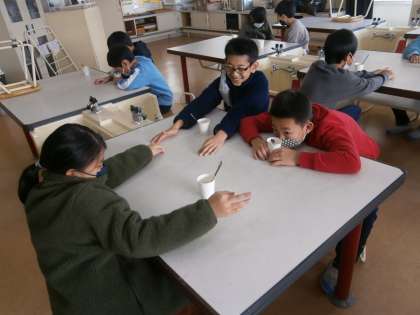 お湯の中に金属のスプーンを入れ、お湯に触れていない部分は温かくなるか、実験しました。