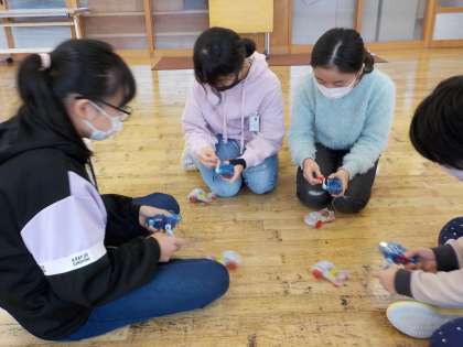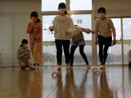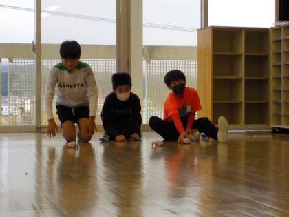 電気のはたらきの学習をしています。電気は発電して熱や光、運動に変化させることができます。今日は、電気を運動に変えて動くモーターカーを作って走らせました。蓄電したコンデンサーを使って走らせ足り、手回し発電機と繋いで進行方向を変化させたりして、楽しみながら学習していました。