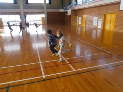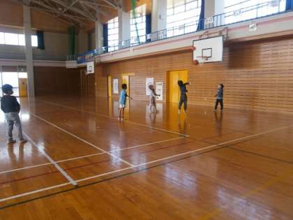 今日のわくわくタイムは体育館が使えたので、バスケットボールをして遊びました。
