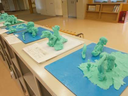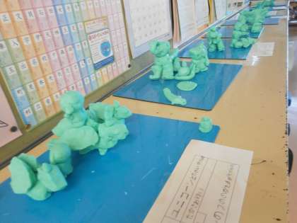 ねんどで「いっしょにおさんぽ」をしている作品を作りました。動物や恐竜に乗ったり、手を繋いだりしている様子を上手に表しました。