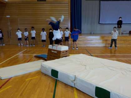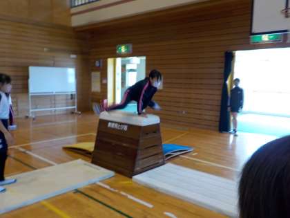 とびばこ運動をがんばっています。子供たちは、新しい技や大きな跳び箱に挑戦しています。