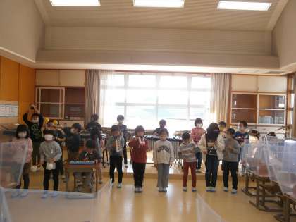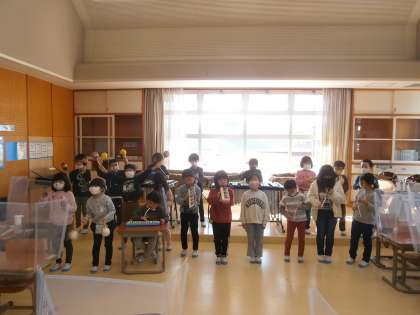 星空を思い浮かべながら、それぞれの楽器を思い思いに演奏しました。同じ楽器でも違うリズムでならしたり、たくさんの楽器を使っても、合わさって一つになれたねと喜び合っていました。