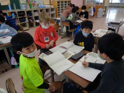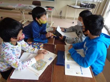 グループの友達と意見を出し合い、楽しんで物語を作成しました。