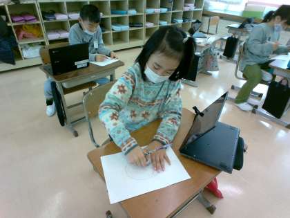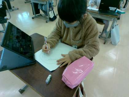 図画工作科「たのしくうつして」の学習で、紙版画を行います。今日は、自分の顔の写真を撮りじっくり見て、口や鼻などのパーツ一つ一つを丁寧に描いていました。