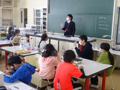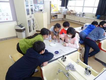 「食塩が水に溶ける限界はどこにあるのだろう。」という問題をもち、実験で確かめました。食塩が水に溶けている様子をよく観察しながら進めました。