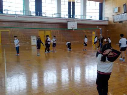 体育の学習で、キャッチバレーボールをしています。今日は、チームのトスから、アタックを相手のコートに入れる練習をしました。最初はネットにひっかかってなかなかうまくいかなかったのですが、練習するうちにどんどんコートに入るようになりました。来週は、体育の準備運動になわとびを使います。準備をよろしくお願いします。
