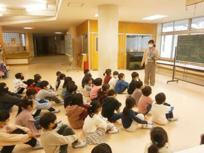 2月に来年入学予定の年長児さんたちを招いて、学校探検やお店屋さんをします。いよいよ、自分たちよりも年下の人たちにお世話したり、一緒に遊んだりする立場になりました。幼稚園・保育園と大庄小学校の架け橋になろうと頑張っています!