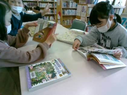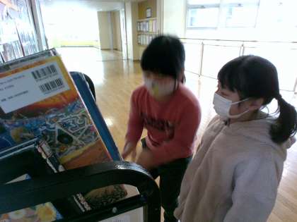図書室に本を借りに行きました。借りていた本は、丁寧に整頓して返却していました。借りる本が決まると、物語の世界に集中して入り込んでいました。