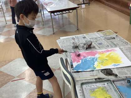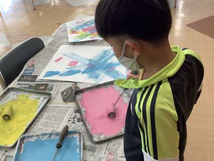 今日の図工から、ローラー版画が始まりました。まずは、明るい色をローラで転がし色付けました。転がし方や力の入れ具合で、模様が変わることに気付いた子供たちは、楽しそうに自分だけの世界を描いていました。