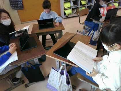 今日は、たぬきの糸車という話の中で、一番好きな場面を音読しました。たぬきやおかみさんの気持ちになって、声の出し方や大きさなどを工夫していました。今までで一番上手な音読を聞くことができました。友達が描いた絵を「上手だね」「かわいい」と、褒める子供たちも素敵でした。