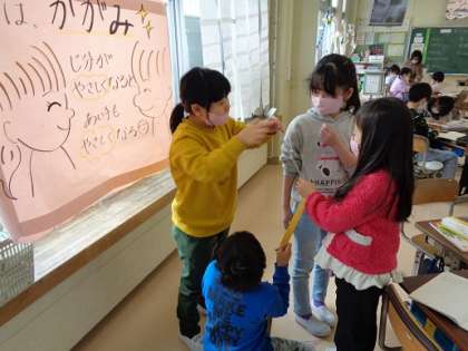 算数科の学習で自分の体の長さについて調べました。竹ものさし一つでは足りないときは、友達と協力して活動しました。100センチメートルは、1メートルとも言えるということも学びました。
