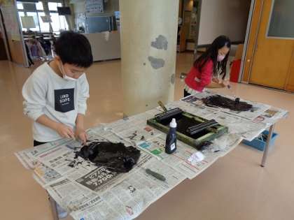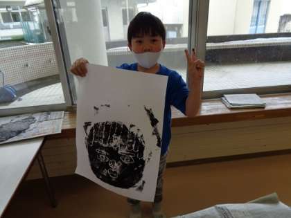図画工作科の学習で紙版画を行っています。今日は、自分の顔が完成した人から黒インクをつけていきました。インクを付けてこすり、紙をめくって自分の顔がうつっているのを見ると、「おおお!」と感動していました。友達の作業のお手伝いも進んで行うぴかぴかさんもたくさんいました。