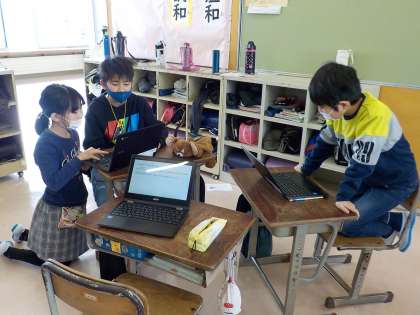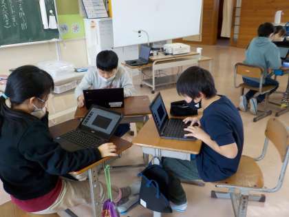 地球温暖化について、調べたことや考えたことをスライドにまとめて、発表しました。どんな資料があると分かりやすいかなどを考え、互いにアドバイスをしていました。