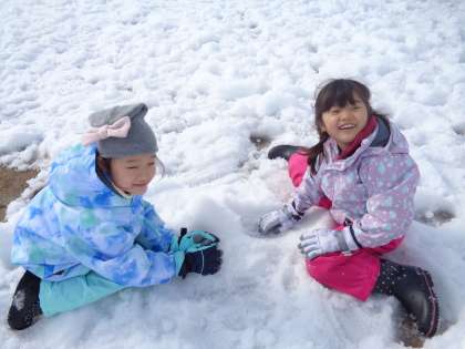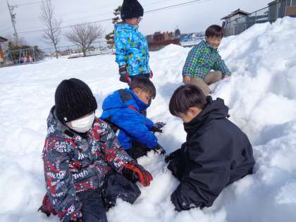 今日は、生活の学習で雪遊びをしました。きれいな雪山を作ったり、雪合戦したりと、友達と冬を楽しむ様子が見られました。