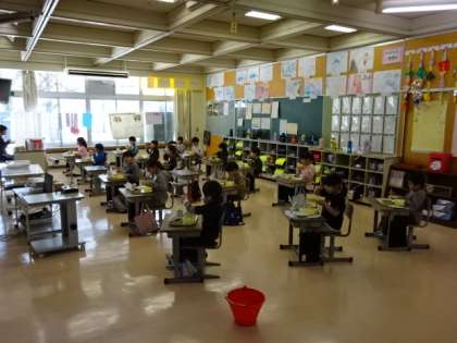 給食の配膳スペースの関係で1年1組は教室、1年2組はランチルームBで給食をとっています。どちらも姿勢良く、静かに食べています。