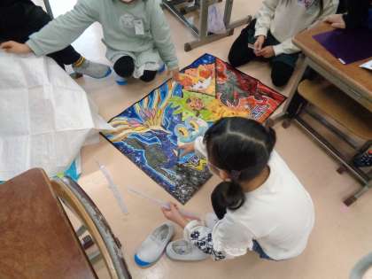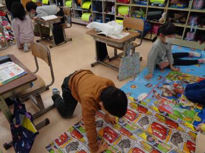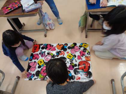 今日の算数は、どちらがひろいの学習をしました。自分たちが持ってきたレジャーシートと、友達のものを比べながら、どうすると広さを比べられるか考える子供たち。「はじとはじをそろえよう」「マス何個分かで考えよう」などと、実際にものさしなども使いながら比べることができました。