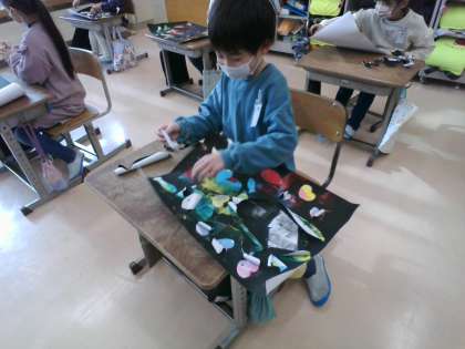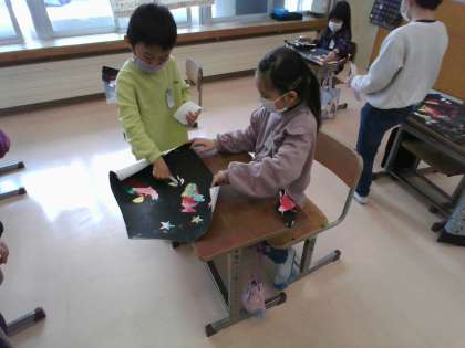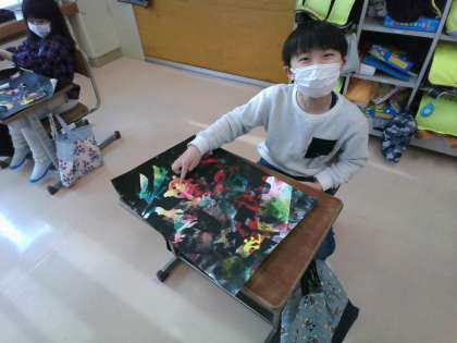 長い時間をかけてつくったローラー版画が、ついに完成しました。シールを剥がすと、隠れていたカラフルな色と形に子供たちはびっくりしていました。自分だけの世界が出来上がりましたね。
