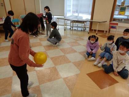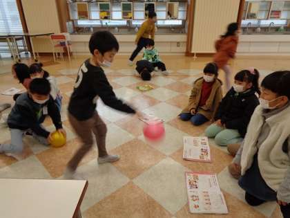 音楽科の学習で、「あんたがたどこさ」にチャレンジしました。曲に合わせてボールをついたり、足をあげたりすることはとても難しかったですが、回数を重ねるごとにどんどん上手になっていきました。