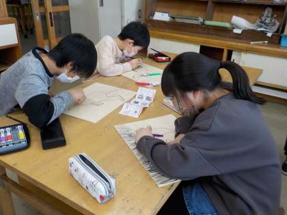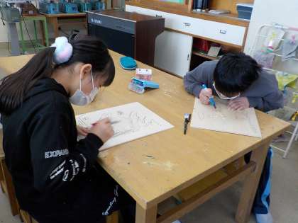 図画工作科の学習で版画を作成しています。安全に気を付けながら、彫刻刀を使って、一生懸命に彫り進めています。