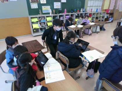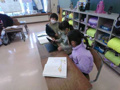 今日の国語は、「ずうっと、ずっと、大すきだよ」の主人公は誰なのかについて、話し合いました。「題名は、ぼくがエルフに話している言葉だから、ぼくが主人公だよ」「エルフの話がいっぱいでてきているからエルフが主人公だよ」など、いろいろな意見が出てきていました。さて、主人公は誰なんでしょうか。まだまだ話し合いが必要ですね。