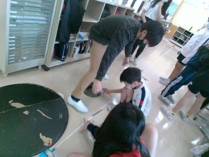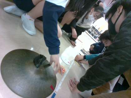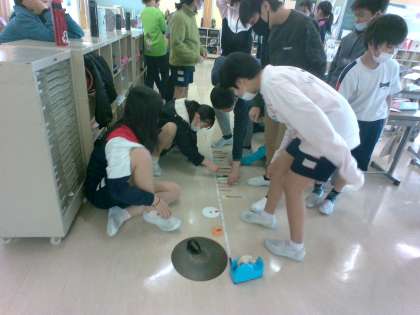 算数科で円周について学習しました。CDやシンバル、ティンパニのカバーなど、円形のものを転がして1周させると、何cmになるのか予想をしながら確かめました。「横の長さを3倍にすればだいたいわかるよ。」「思ったよりも長かった。」と意欲的に活動に取り組んでいました。