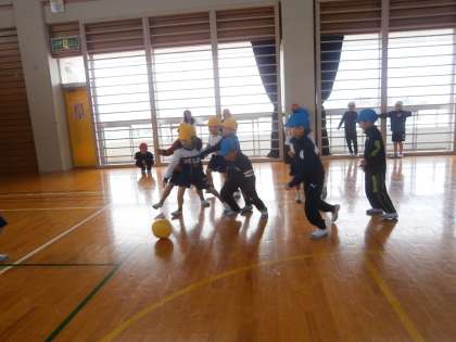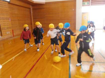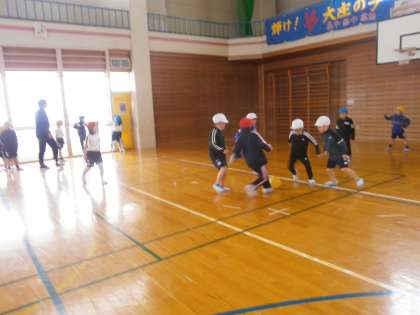 体育で簡単なサッカーをしました。ラインは無しでどこまでもゲームが続きます。どの団も楽しそうにボールを追っていました。