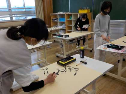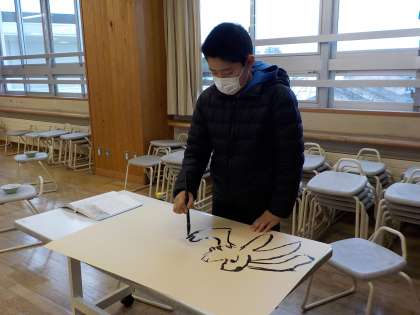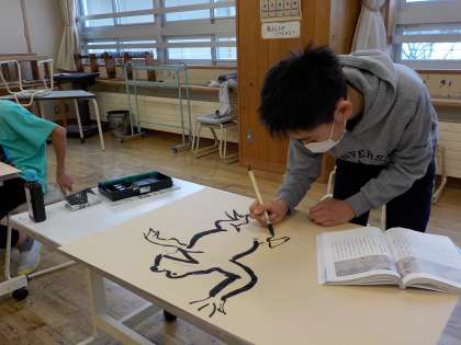 墨絵に挑戦した6年生。国語で学習した「鳥獣戯画」を描きました。水を使ってにじませたり、擦れさせたりと工夫していました。大きな紙にダイナミックに描き上げました。