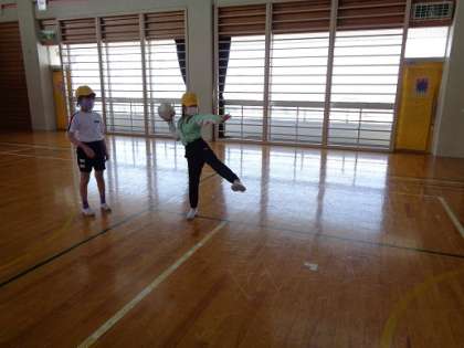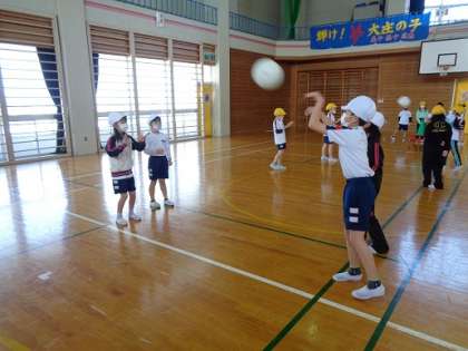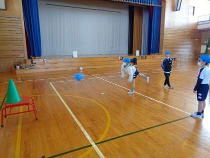 体育科の学習で、「ドーナツゲーム」を行いました。友達とボールをパスしたあと、輪の中にあるコーンに当たれば得点が入るゲームです。限られた時間の中で、正確に当てるためにどすこい投げを意識したり、無駄のないようてきぱき行動したりするなど、自分たちで考えながら動く姿がたくさん見られました。