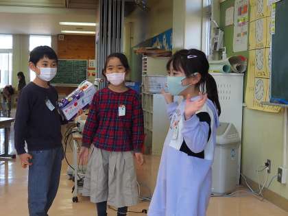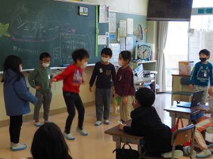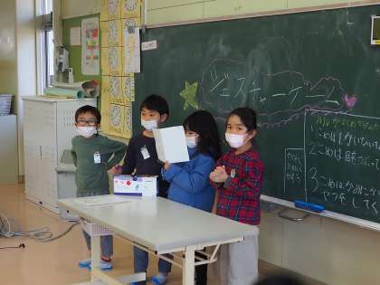 今日ののびのび・わくわくタイムに、工作係が企画した「くじびきジェスチャーゲーム」を行いました。準備や進行は、すべて子供たちがしています。みんなで作り上げた活動なだけあって、子供たちは楽しそうに取り組んでいました。