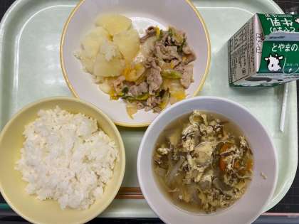 【献 立】 ごはん、牛乳 豚肉のキムチ炒め こふきいも 卵ともずくのスープ