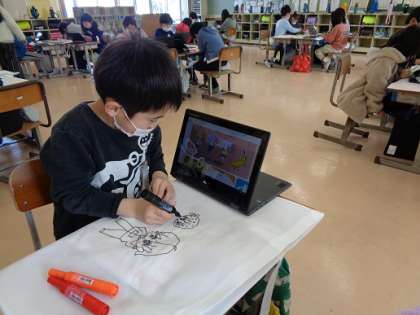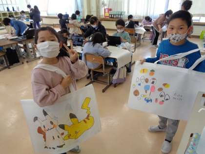 図工などの作品を持ち帰る袋に、イラストや模様を描いてオリジナルバッグをデザインしました。作品を持ち帰るときに、自分のバッグを見て自然と笑顔になれるといいなと思います。