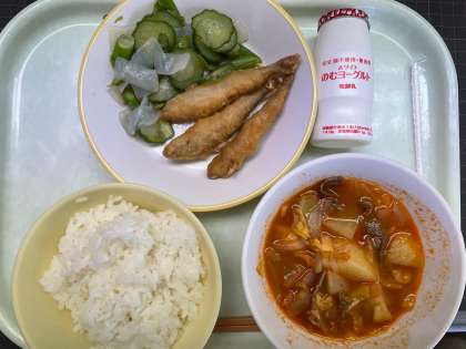 ・今年度最後の給食です。3人の調理員さん、栄養教諭の中澤先生のおかげで、1年間安全でおいしい給食をいただくことができました。ありがとうございました。