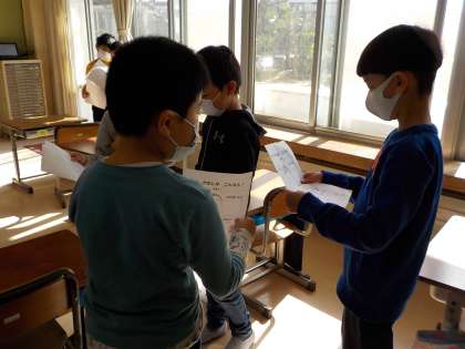 「ぼく・わたしはこんな人!」のカードを使って、簡単に自己紹介をしました。普段生活をしている友達の好きな遊びや食べ物などを聞き合い、友達のことを改めて知る機会になりました。