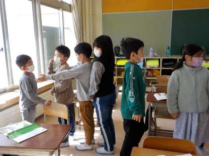 一学期、2日目の登校です。国語の学習では、条件に合わせて順番に並ぶゲームをしました。声を掛け合って、素早く並ぶことができた子供たちです。
