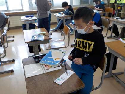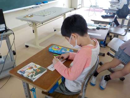 すき間時間を利用して、クラス内で使う名札を作りました。丁寧に名前を書き、好きな色やイラストをつけました。思い思いの名札を作った子供たちです。